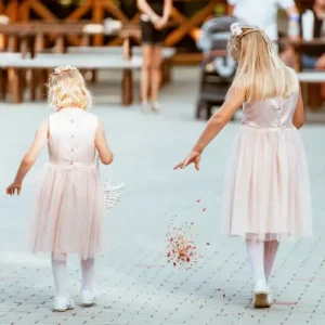 – A koszorúslányok kosárkákból szórják a szirmokat a menyasszony bevonulása előtt.