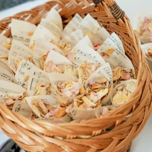 Az esküvői konfetti szórás megismételhetetlen pillanatáról a fotósok is gyönyörű képeket tudnak készíteni, amikor a vendégek a sziromszóró tölcsérből rátok szórják a természetes, szárított szirmokat.